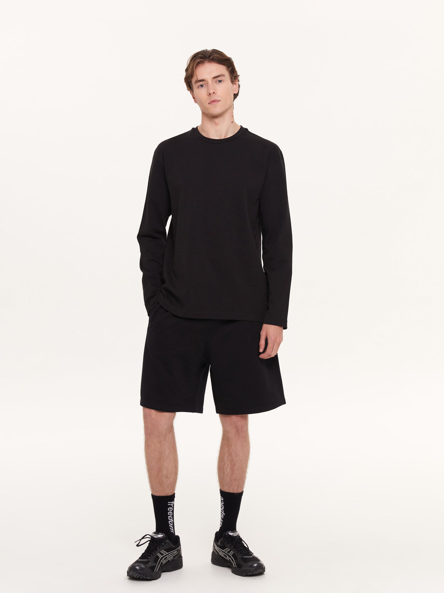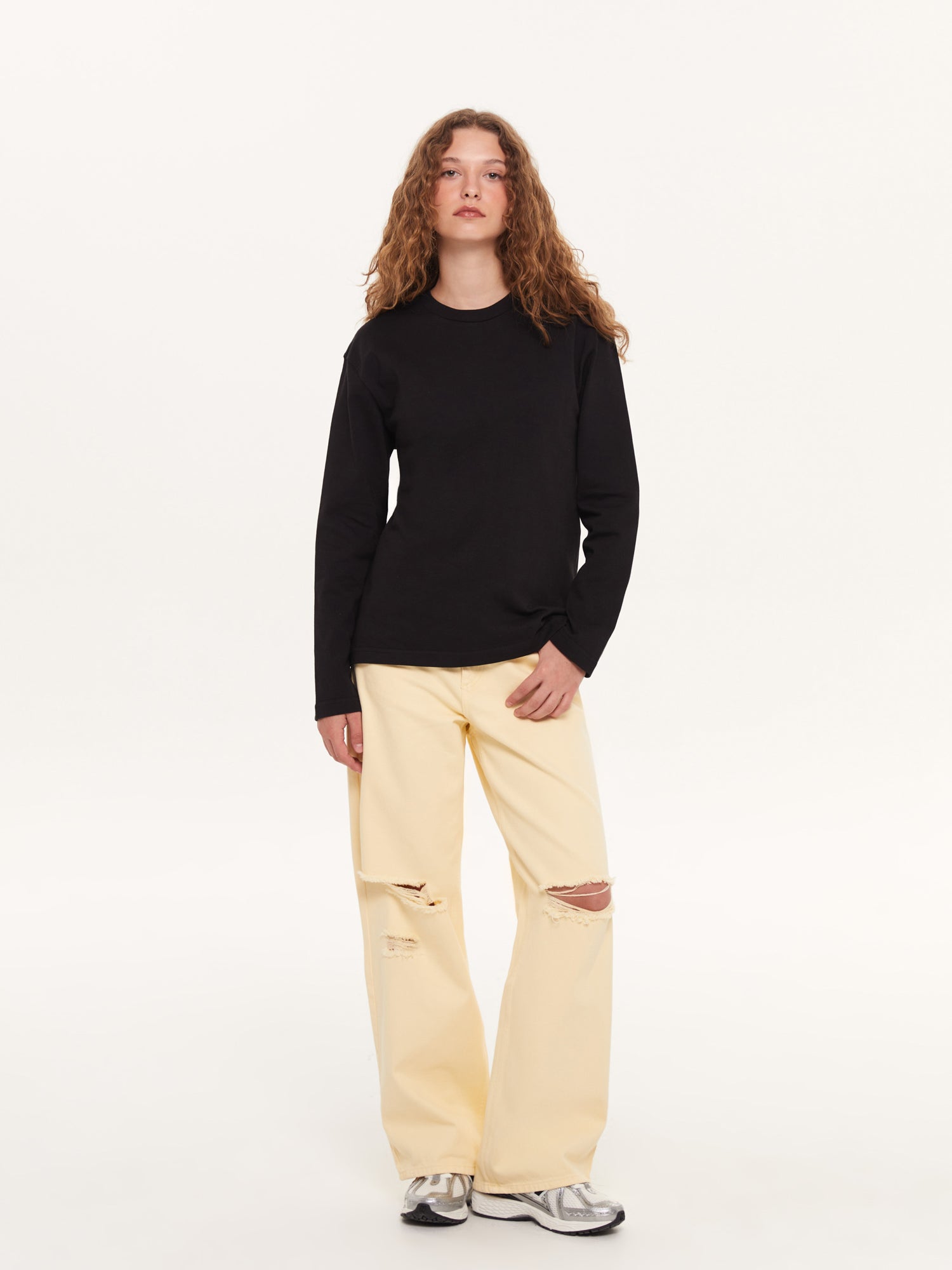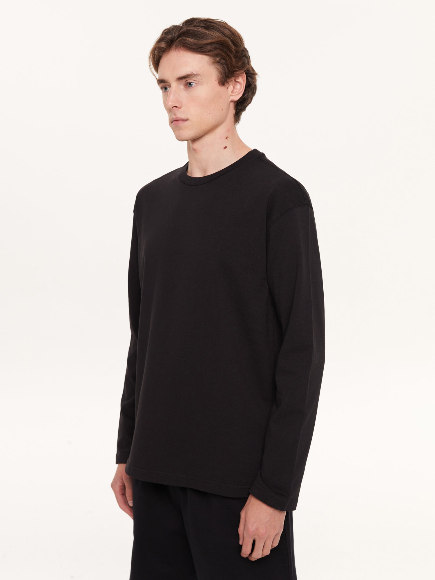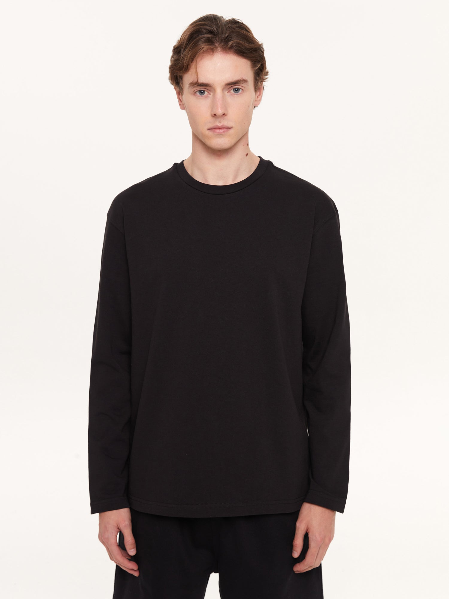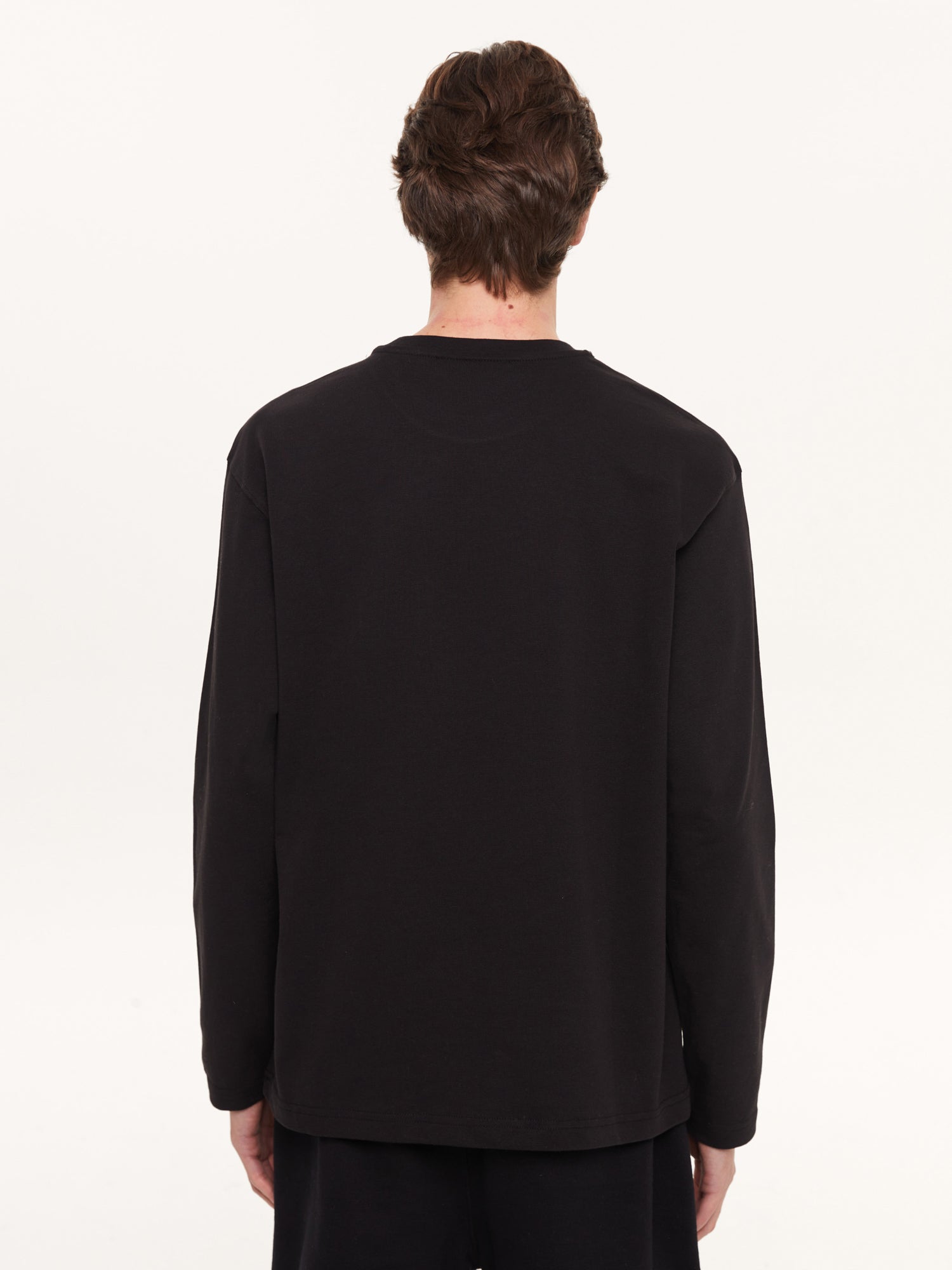 An essential piece from the Space Collection: the black long-sleeve T-shirt! Not as heavy as a sweatshirt, yet not as light as a regular T-shirt – the perfect balance you've been looking for. Offering comfort all day, pair it with light-colored pants with ripped details for contrast or keep it simple on its own. Designed for those who value both minimalism and comfort.