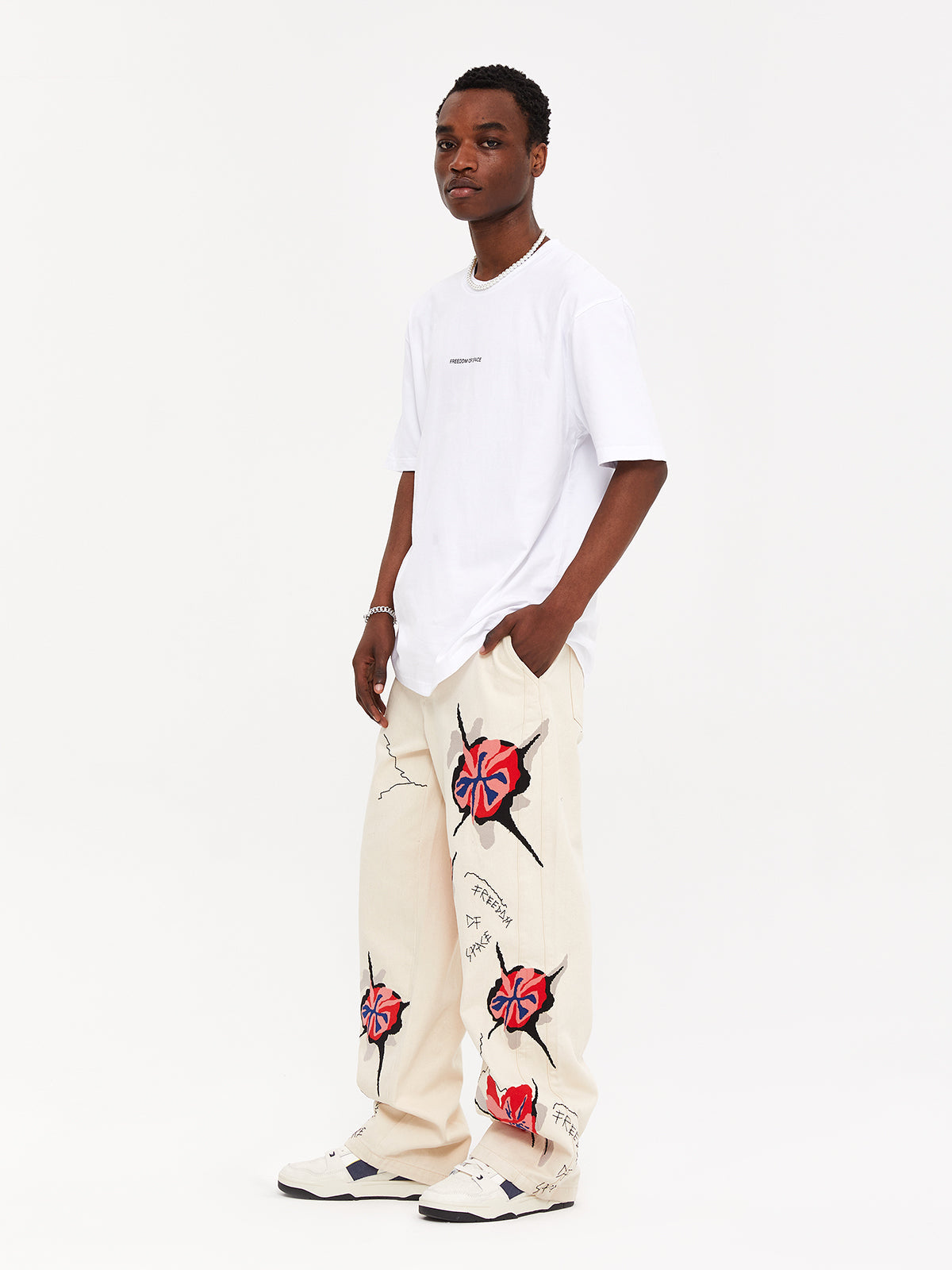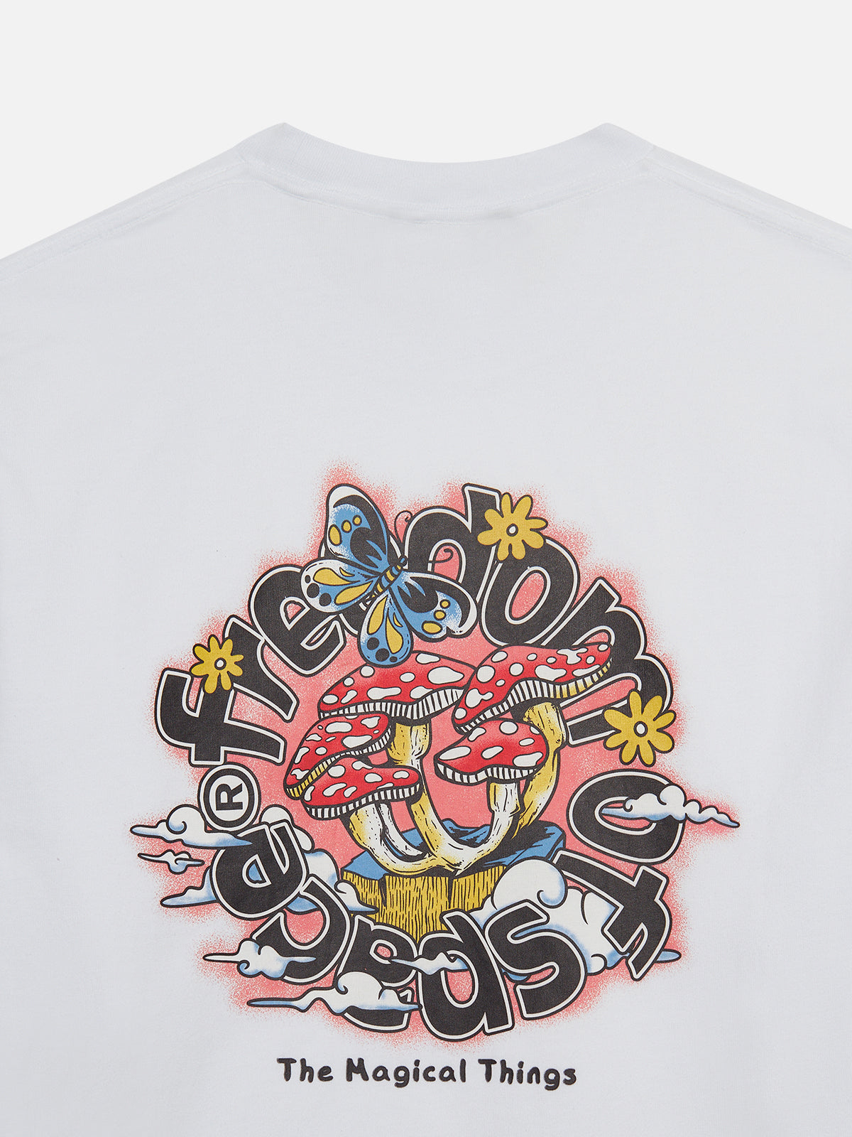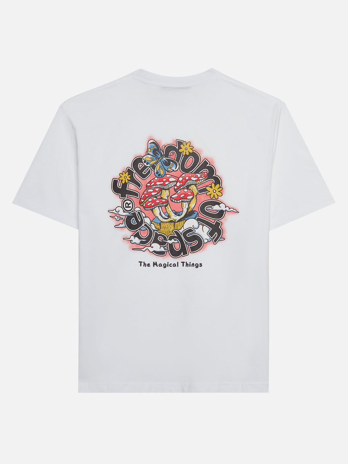 White t-shirt with multi color big hit back, black small hit front