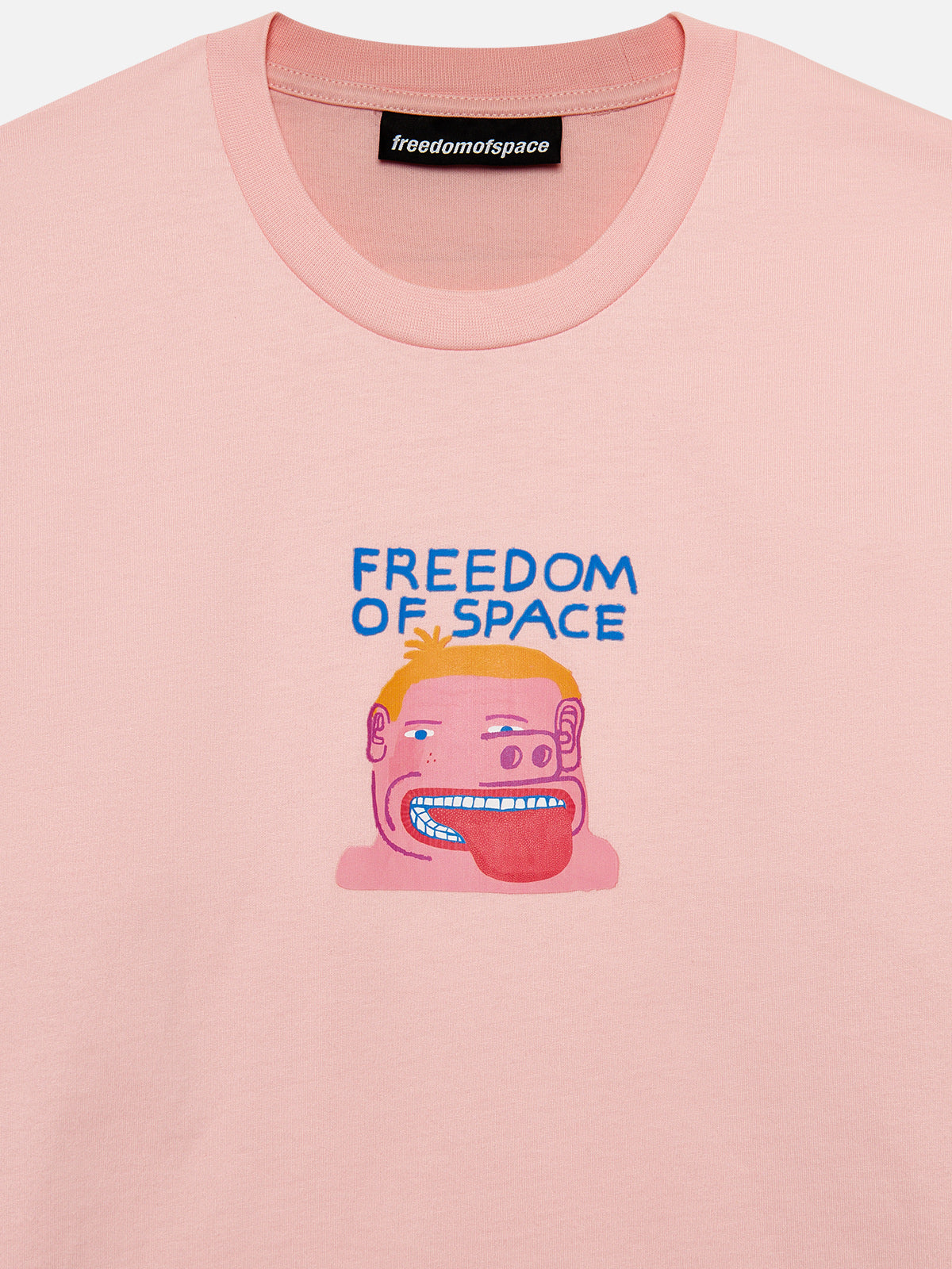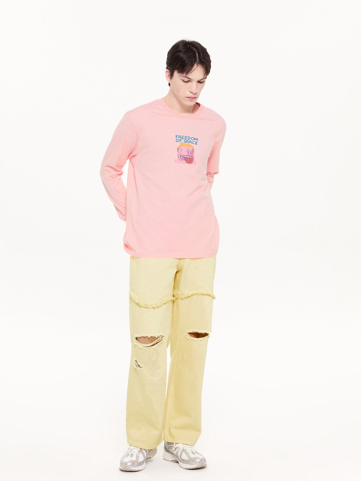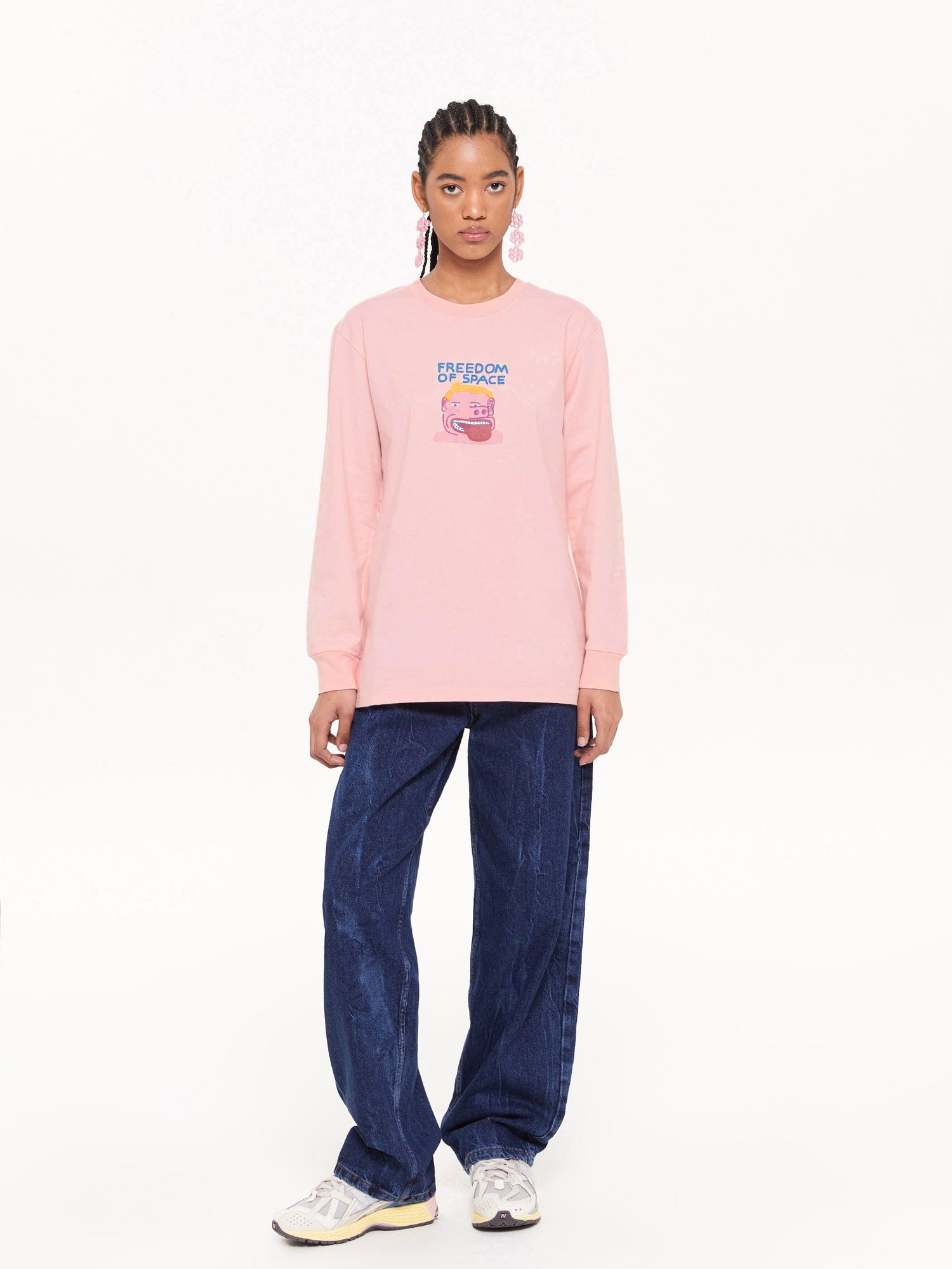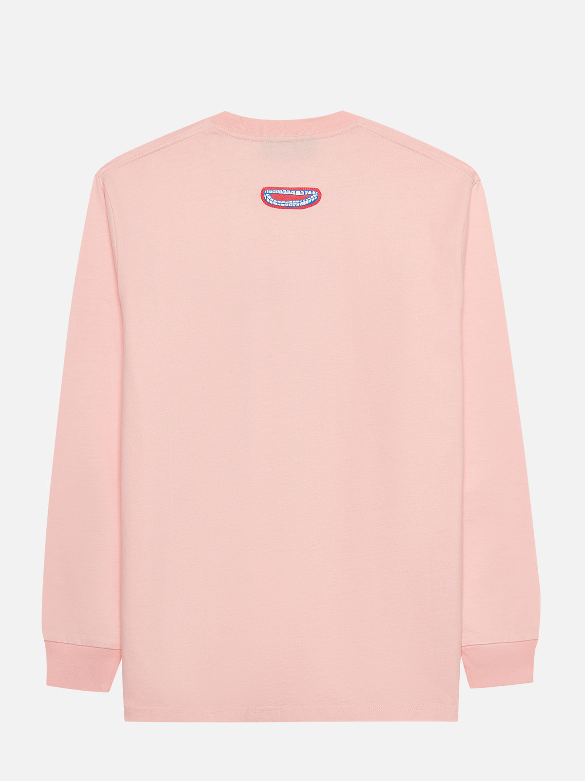 Pink long sleeve t-shirt with multi color big hit front, small hit back